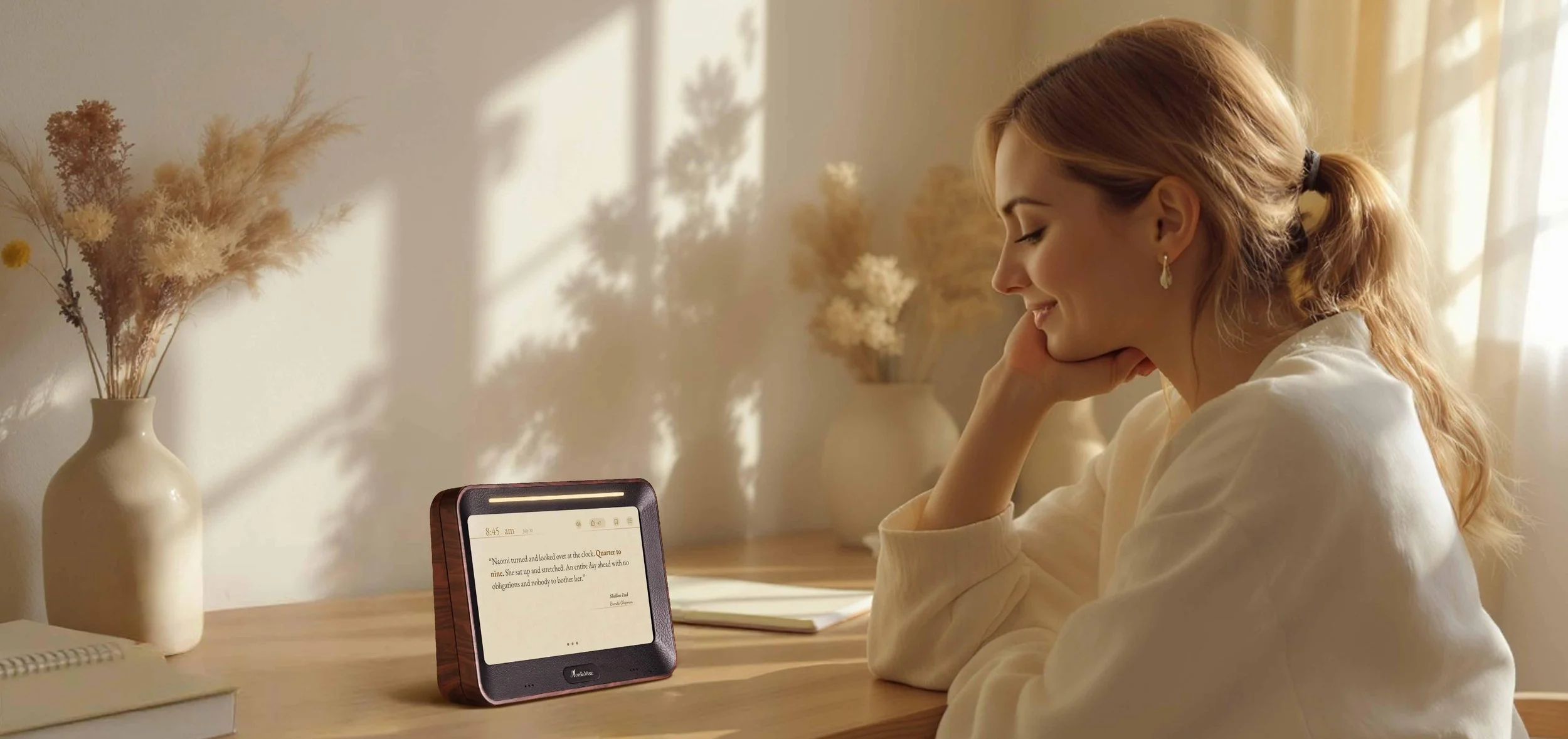 NovellaMate greets your morning with time, weather, and a quote from a beloved writer — so your day begins with literature, not noise.